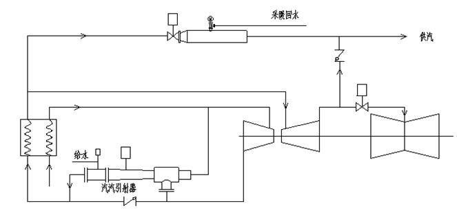 如圖五所示:采用供熱引射器獲得較高的供熱壓力有以下優(yōu)勢(shì):4.3.1解決小負(fù)荷下中排壓力低不能滿足供熱要求問(wèn)題。4.3.2管徑選的細(xì)一些可以節(jié)省投資減少散熱量。4.3.3換熱器的換熱系數(shù)可以增大,節(jié)省換熱面積。4.3.4增加蒸汽節(jié)能靈活性措施,如引射乏汽、熱泵及小汽輪機(jī)拖動(dòng)等。4.4汽汽引射器技術(shù)發(fā)展簡(jiǎn)介,編寫出了非常精確的計(jì)算軟件。特別是變工況計(jì)算更是難上加難,如果沒(méi)有變工況數(shù)據(jù),引射器的推廣應(yīng)用就大受限制,因?yàn)樽児r是廣泛存在的。除計(jì)算理論正確外,還要通過(guò)長(zhǎng)期大量的實(shí)踐案例來(lái)檢驗(yàn)修正。