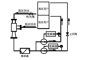 本方案的要點(diǎn)是利用高區(qū)回水的富余壓頭引射低區(qū)回水,以降低低區(qū)循環(huán)水泵用電量。引射裝置叫做水—水噴射器,其設(shè)計(jì)方法在教科書中可以查到。采用此方案可以使高區(qū)回水的富余壓頭 70% 以上得以利用。請(qǐng)參考系統(tǒng)圖三。